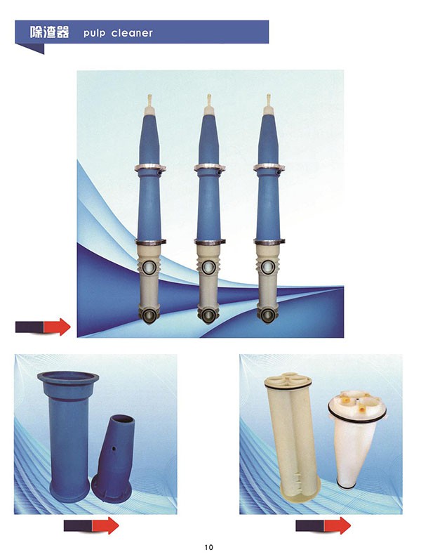 造紙工業中的一種紙漿凈化除渣設備。外形是約8~13度圓錐角的圓錐體,由不銹鋼、硬橡膠或內襯聚乙烯基塑料層的鑄鐵等材料制成。內壁平滑光潔,耐磨、耐壓、耐腐蝕,在40~60℃的溫度下不變形。利用渦旋運動除去較重的雜質。除渣效率較渦流除渣器高,能顯著降低紙漿的塵埃度。且可成束或成排并聯,尾渣可分段再選,減少紙漿除渣的損失。